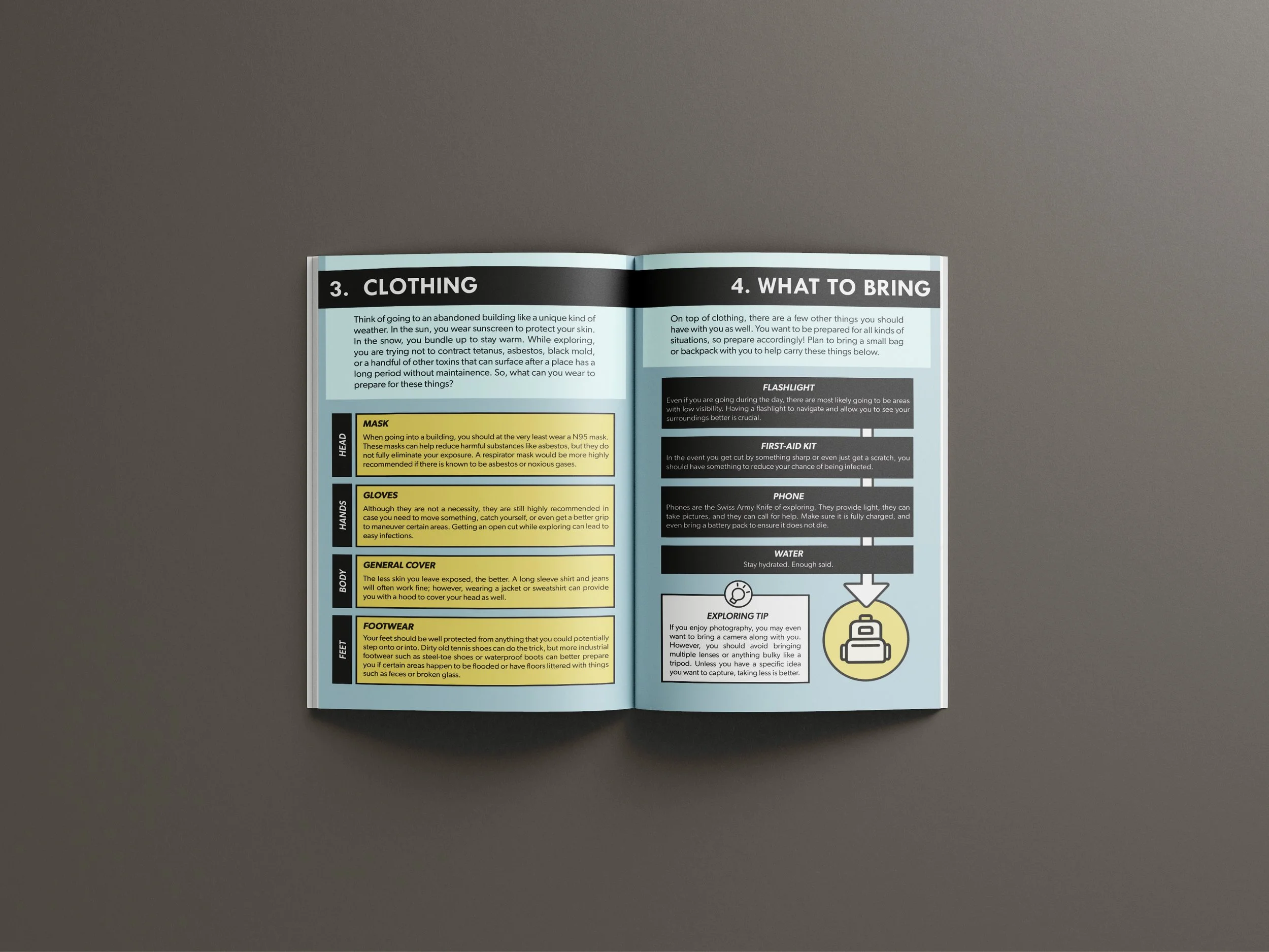One of the larger projects I completed at Cornerstone University was this publication design. I combined my skills in design, writing, and photography to create a guidebook that informs its readers about urban exploring and how to do so safely.